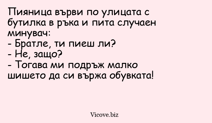 Пияница върви по улицата с бутилка в ръка и пита случаен минувач: