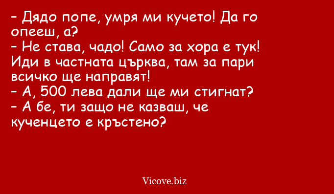 – Дядо попе, умря ми кучето! Да го опееш, а?