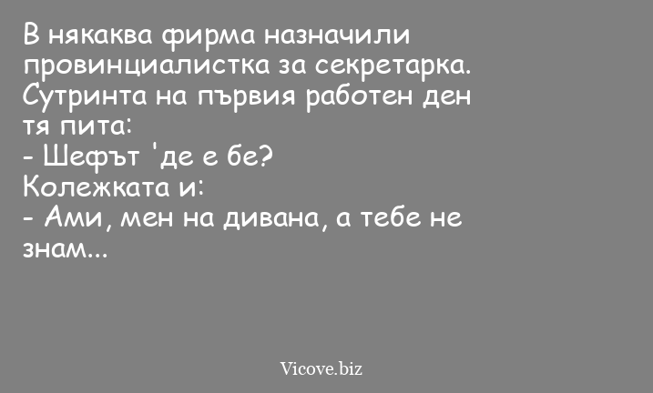 В някаква фирма назначили провинциалистка за секретарка. Сутринта на първия работен ден тя пита: