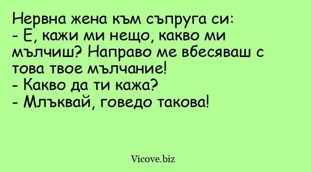 - Е, кажи ми нещо, какво ми мълчиш? Направо ме вбесяваш с това твое мълчание!