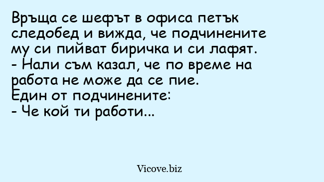 Връща се шефът в офиса петък следобед и вижда, че подчинените му си пийват биричка и си лафят.