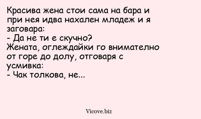 Красива жена стои сама на бара и при нея идва нахален младеж и я заговара:
