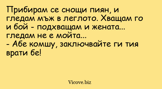 Прибирам се снощи пиян, и гледам мъж в леглото. Хващам го и бой - подхващам и жената... гледам не е мойта...