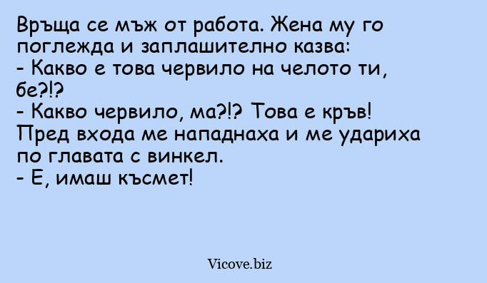 Връща се мъж от работа. Жена му...