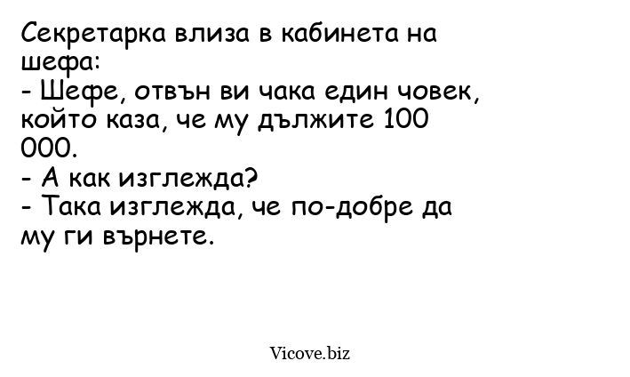 - Шефе, отвън ви чака един човек, който каза, че му дължите 100 000.