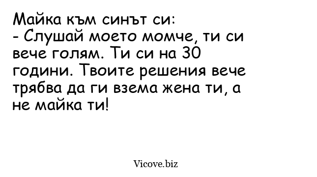- Слушай моето момче, ти си вече голям. Ти си на 30 години. Твоите решения вече трябва да ги взема жена ти, а не майка ти!