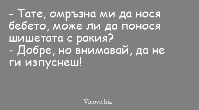 - Тате, омръзна ми да нося бебето, може ли да понося шишетата с ракия?