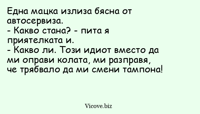 - Какво ли. Този идиот вместо да ми оправи колата, ми разправя, че трябвало да ми смени тампона!
