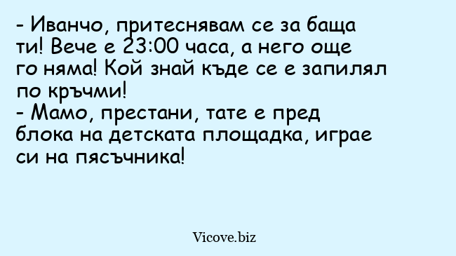 - Иванчо, притеснявам се за баща ти! Вече е 23:00 часа, а него още го няма! Кой знай къде се е запилял по кръчми!