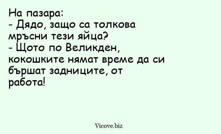- Щото по Великден, кокошките нямат време да си бършат задниците, от работа!