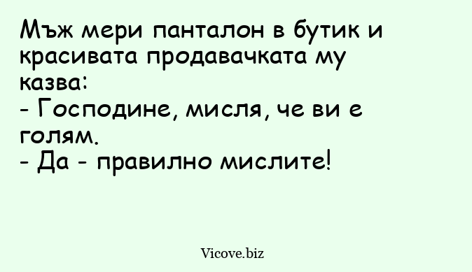 Мъж мери панталон в бутик и красивата продавачката му казва:
