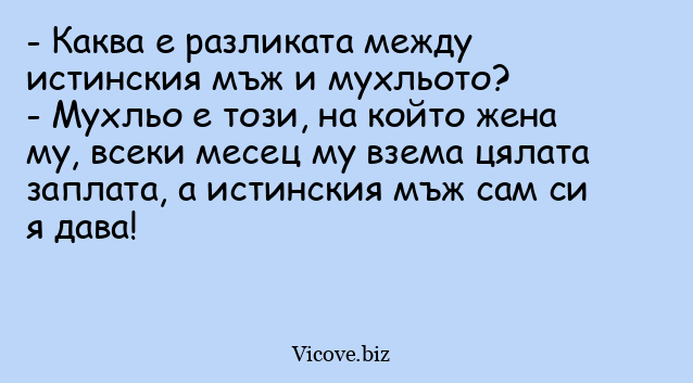 - Мухльо е този, на който жена му, всеки месец му взема цялата заплата, а истинския мъж сам си я дава!