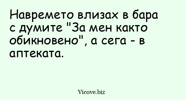 Навремето влизах в бара с думите "За мен както обикновено", а сега - в аптеката.