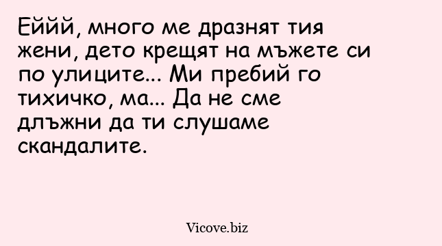 Еййй, много ме дразнят тия жени, дето крещят на мъжете си по улиците... Ми пребий го тихичко, ма... Да не сме длъжни да ти слушаме скандалите.