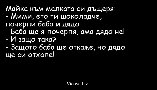 - Мими, ето ти шоколадче, почерпи баба и дядо!