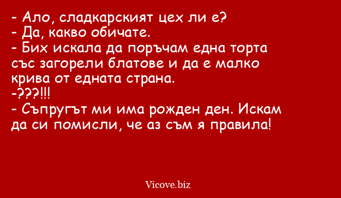 - Бих искала да поръчам една торта със загорели блатове и да е малко крива от едната страна.