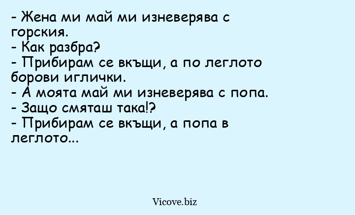 - А моята май ми изневерява с попа.