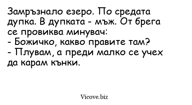 Замръзнало езеро. По средата дупка. В дупката - мъж. От брега се провиква минувач: