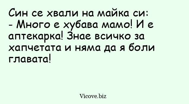 - Много е хубава мамо! И е аптекарка! Знае всичко за хапчетата и няма да я боли главата!