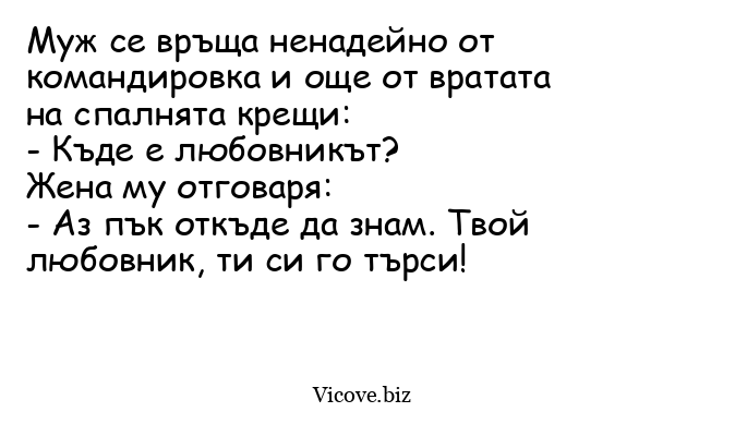 Муж се връща ненадейно от командировка и още от вратата на спалнята крещи: