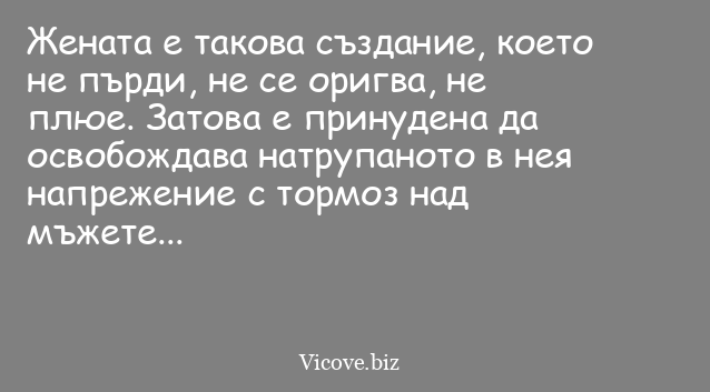 Жената е такова създание, което не пърди, не се оригва, не плюе. Затова е принудена да освобождава натрупаното в нея напрежение с тормоз над мъжете...