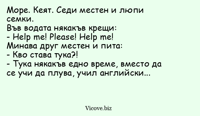 - Тука някакъв едно време, вместо да се учи да плува, учил английски...
