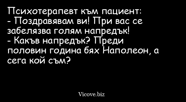 - Какъв напредък? Преди половин година бях Наполеон, а сега кой съм?