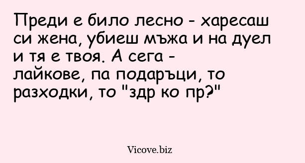 Преди е било лесно - харесаш си жена, убиеш мъжа и на дуел и тя е твоя. А сега - лайкове, па подаръци, то разходки, то "здр ко пр?"