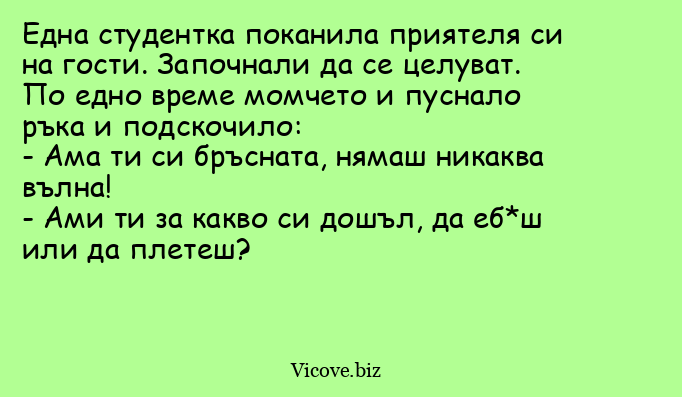 Една студентка поканила приятеля си на гости. Започнали да се целуват. По едно време момчето и пуснало ръка и подскочило: