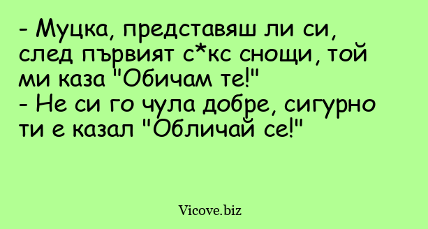 - Муцка, представяш ли си, след първият с*кс снощи, той ми каза "Обичам те!"