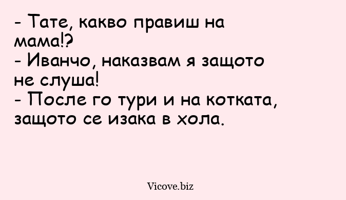- Здравейте, аз съм Петрова, от горния етаж. Синът ми Ви е счупил стъклото на колата с топка и Сте казал, че ще му... майката, ако не го плати.