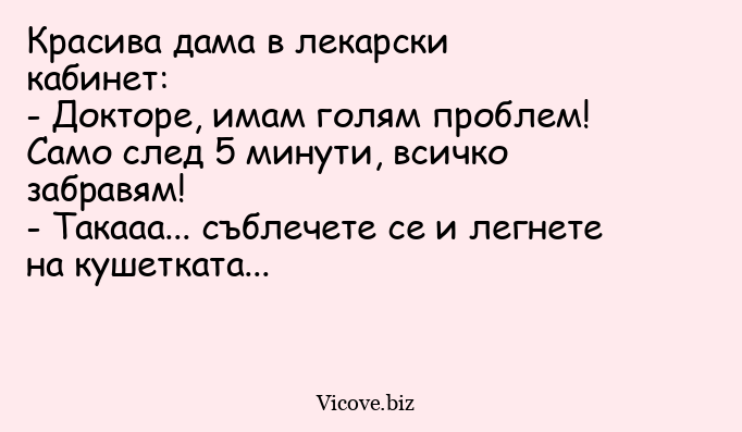 - Докторе, имам голям проблем! Само след 5 минути, всичко забравям!