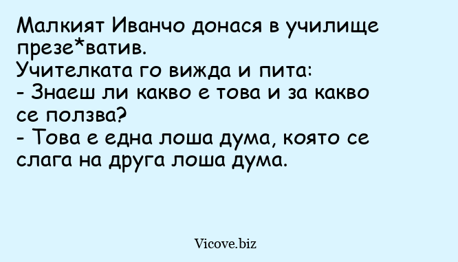 - Учителката каза, че иска да види идиота, който ми е решил задачата по математика.