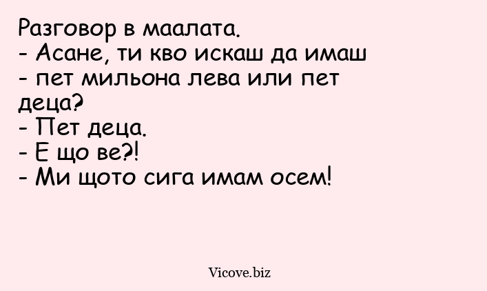 - Асане, ти кво искаш да имаш - пет мильона лева или пет деца?