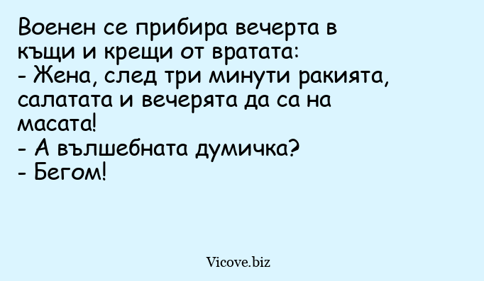 Военен се прибира вечерта в къщи и крещи от вратата: