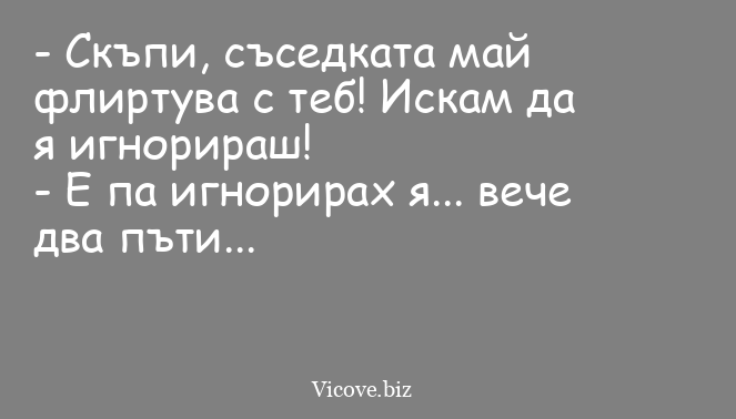- Скъпи, съседката май флиртува с теб! Искам да я игнорираш!