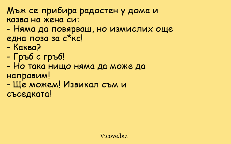 - Няма да повярваш, но измислих още една поза за с*кс!