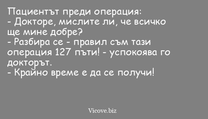 - Разбира се - правил съм тази операция 127 пъти! - успокоява го докторът.