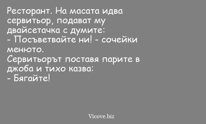 Ресторант. На масата идва сервитьор, подават му двайсетачка с думите: