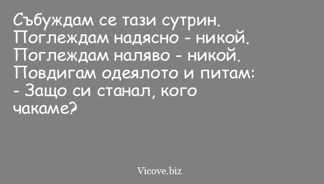 Събуждам се тази сутрин. Поглеждам надясно - никой. Поглеждам наляво - никой. Повдигам одеялото и питам: