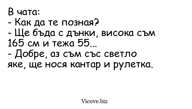 - Добре, аз съм със светло яке, ще нося кантар и рулетка.