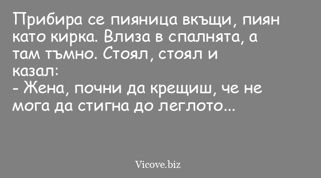 Прибира се пияница вкъщи, пиян като кирка. Влиза в спалнята, а там тъмно. Стоял, стоял и казал: