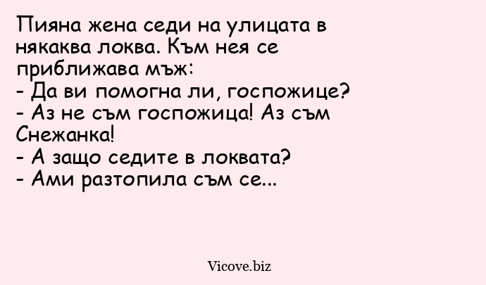 Пияна жена седи на улицата в някаква локва. Към нея се приближава мъж: