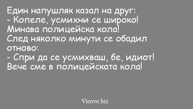 - Спри да се усмихваш, бе, идиот! Вече сме в полицейската кола!