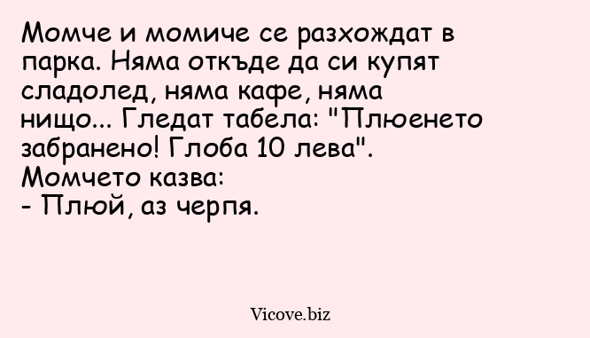 Момче и момиче се разхождат в парка. Няма откъде да си купят сладолед, няма кафе, няма нищо... Гледат табела: "Плюенето забранено! Глоба 10 лева". Момчето казва: