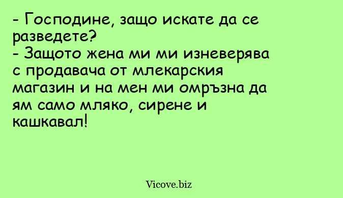 - Защото жена ми ми изневерява с продавача от млекарския магазин и на мен ми омръзна да ям само мляко, сирене и кашкавал!