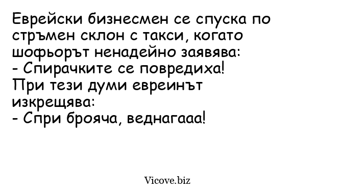 Еврейски бизнесмен се спуска по стръмен склон с такси, когато шофьорът ненадейно заявява: