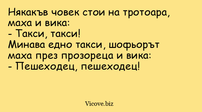 Минава едно такси, шофьорът маха през прозореца и вика: