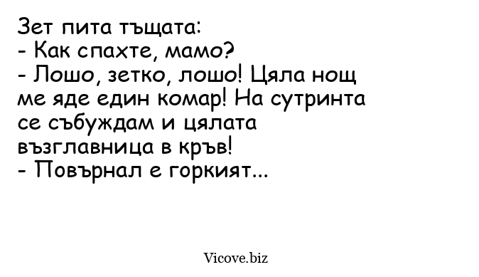 - Лошо, зетко, лошо! Цяла нощ ме яде един комар! На сутринта се събyждaм и цялaтa възглавница в кръв!