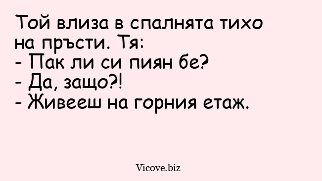 Жена се връща от магазина с три бири, 2 бутилки водка, 3 бутилки вино и 2 хляба. Мъжът и: